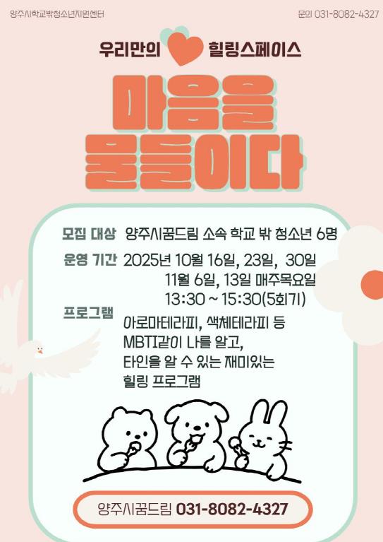 센터 관계자는 “양주시 꿈드림의 집단상담은 단순한 상담 프로그램을 넘어 청소년이 스스로를 돌아보고, 또래와 함께 성장해가는 소중한 시간”이라며, “앞으로도 청소년 눈높이에 맞춘 다양한 맞춤형 프로그램을 지속적으로 제공하겠다”고 전했다.