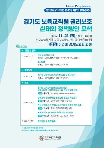 주제발표에서는 ▲중앙 및 경기도 보육교직원 권리보호 지원 정책 ▲경기도 보육교직원 권리보호 실태조사 결과를 중심으로 경기도 정책방향을 종합적으로 제안하며, 현장 및 학계 전문가들의 의견을 반영해 정책제안의 실효성을 높일 예정이다.