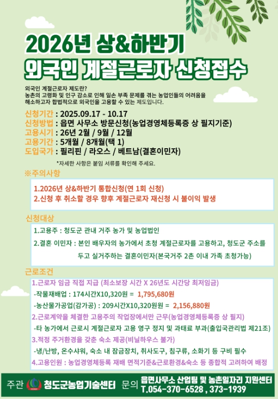 [메이저뉴스]청도군은 농촌 인구감소와 고령화로 인한 농번기 일손 부족 문제 해소를 위해 9월 17일부터 10월 17일까지 '2026년 상·하반기 외국인 계절근로자' 고용 희망농가 수요조사를 실시하고 있다.