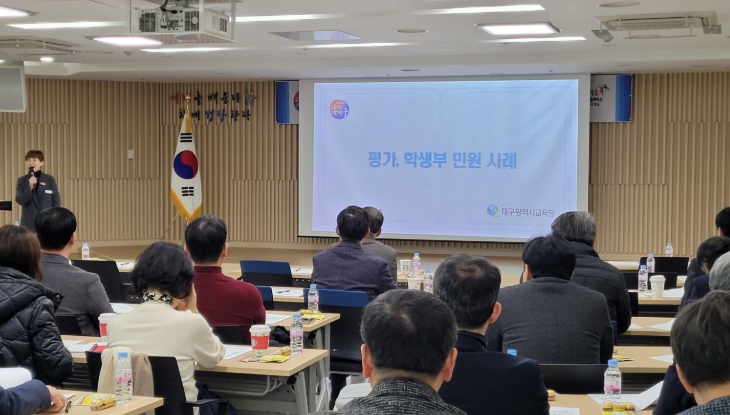 [메이저뉴스]대구시교육청은 12월 22일 오후 2시부터 동관 7층 대회의실에서 사립 학교의 학사 운영 전반에 대한 이해를 돕고, 안정적이고 책임 있는 학교 운영을 지원하기 위해 사립 고등학교장 49명을 대상으로 ‘학사운영 역량 강화 전달 연수’를 실시한다.