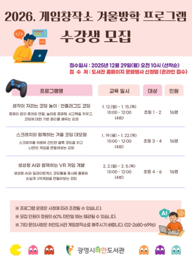김광용 하안도서관장은 “이번 겨울방학 프로그램은 아이들이 창의 교육을 통해 디지털 세상의 원리를 이해하고, 스스로 문제를 해결하는 능력을 기를 수 있는 기회가 될 것”이라며 “미래 교육에 관심 있는 학생과 학부모의 많은 참여를 바란다”고 말했다.
