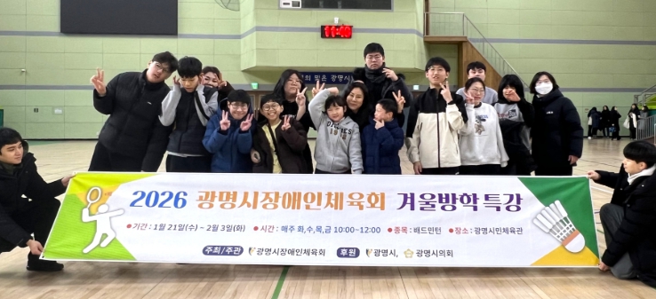 | ▲ 지난 3일 광명시민체육관에서 '2026년 광명시장애인체육회 겨울방학 특강'을 진행하고 기념사진을 촬영하고 있다. |