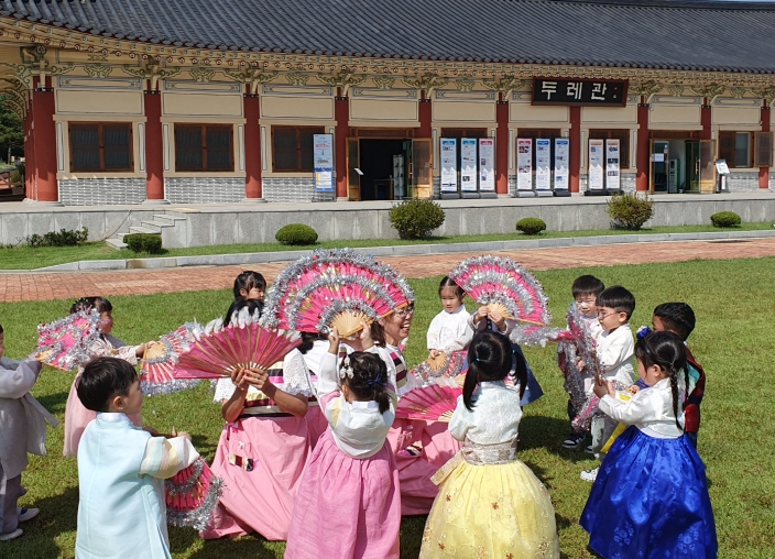 | ▲ 증평민속체험박물관 한복 입고 전통놀이 체험하는 아이들 |