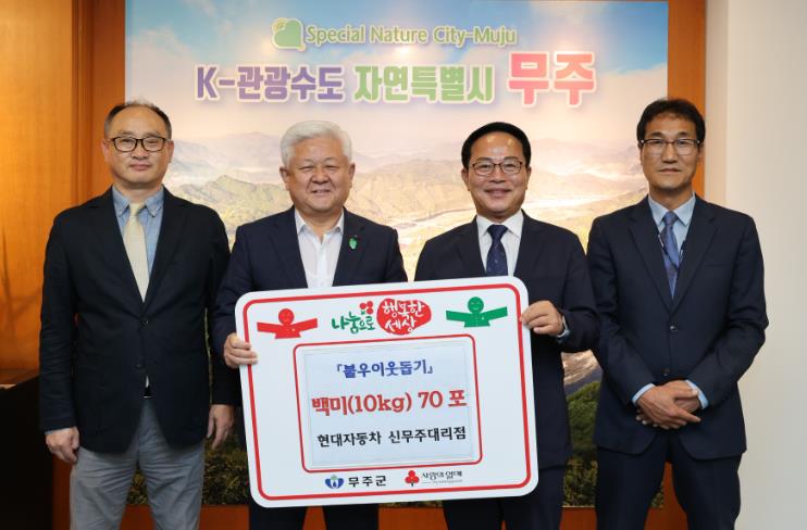 [메이저뉴스]현대자동차 신무주대리점은 지난 13일 무주군에 쌀 70포대(1포대 10kg)를 지정 기탁하며 훈훈함을 전했다.