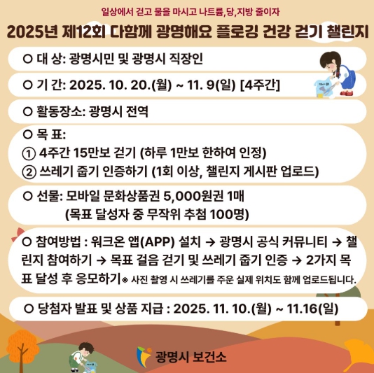 [메이저뉴스]광명시 보건소는 오는 20일부터 11월 9일까지 4주간 ‘제12회 다함께 광명해요! 플로깅 건강 걷기 챌린지’를 운영한다.