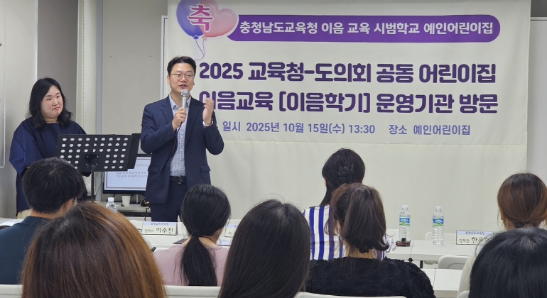 [메이저뉴스]충남교육청은 15일, 충청남도의회 신한철 의원과 함께 천안시 예인어린이집을 대상으로 어린이집 이음교육(이음학기) 운영 현장을 방문했다.