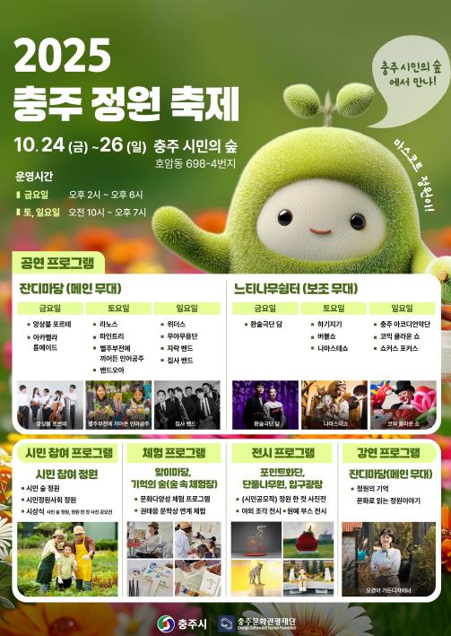 [메이저뉴스] 충주시와 (재)충주문화관광재단은 10월 24일부터 26일까지 3일간 충주 시민의 숲(호암동 698-4번지)에서 ‘2025 충주 정원 축제’를 개최한다고 밝혔다.