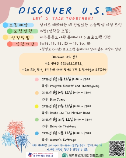 [메이저뉴스] 제주특별자치도 한라도서관은 주한미국대사관과 협력해 도민의 글로벌 이해와 영어 활용 역량 강화를 위한 교육 프로그램 ‘Discover U.S.’를 올해부터 운영한다고 밝혔다.