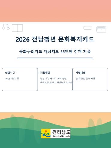 [메이저뉴스]전라남도는 2026년부터 전남 청년 문화복지카드 사업 추진 시 경제적 취약 계층(기초생활수급자·차상위계층)이 수혜를 받는 문화누리카드 지급자에게도 25만 원 전액을 지급한다고 밝혔다.
