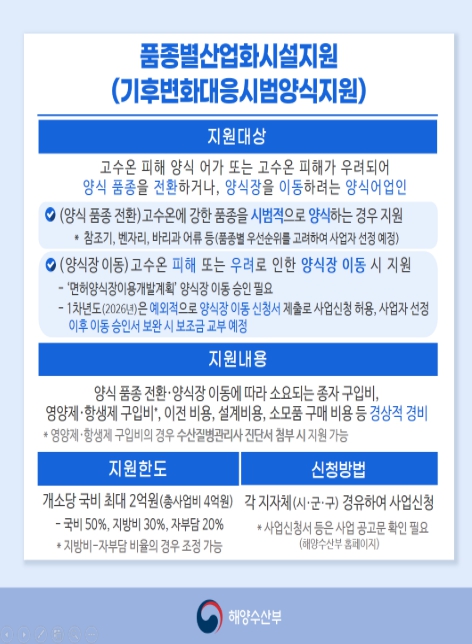 [메이저뉴스] 해양수산부는 기후변화에 선제적으로 대응하고 어가의 소득 안정을 도모하기 위해 2월 23일부터 3월 31일까지 ‘2026년 기후변화 대응 시범 양식 지원사업’ 대상 어가를 공모한다고 밝혔다.