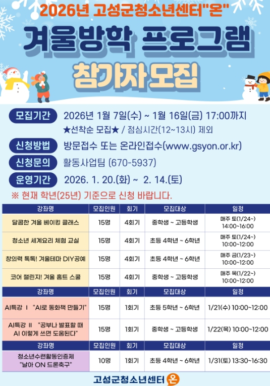 [메이저뉴스]고성군청소년센터“온”은 겨울방학을 맞이한 관내 청소년들을 대상으로 2026년 1월 20일부터 2월 14일까지 2026년 겨울방학 프로그램 및 특강을 운영한다.