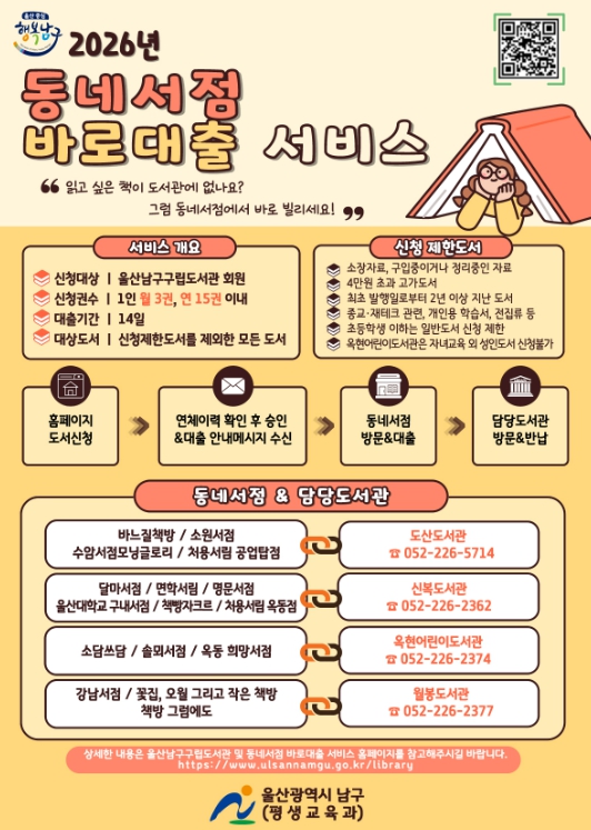 [메이저뉴스] 울산 남구는 2026년 ‘동네서점 바로대출’서비스를 2일부터 운영한다.