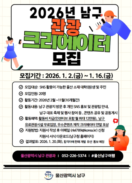 선발된 관광크리에이터는 26년 2월부터 11월까지 남구 관광지와 이색 체험 시설, 사진 명소, 맛집 등을 방문한 후 개인 SNS에 홍보하고 남구의 대표 축제와 주요 행사에 참여해 생생한 후기를 전달하는 역할을 맡는다.