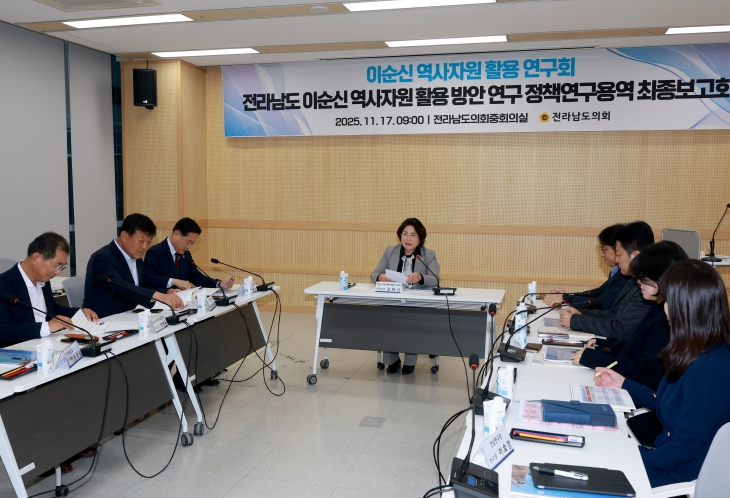 [메이저뉴스]전라남도의회 이순신 역사자원 활용 연구회(대표의원 김화신)는 17일 도의회 중회의실에서 '전라남도 이순신 역사자원 활용 방안 연구'최종보고회를 개최했다.