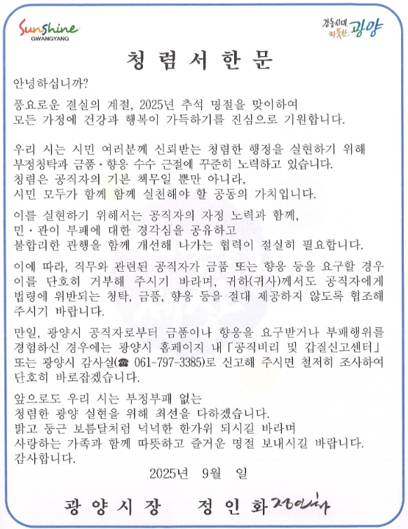 [메이저뉴스]광양시가 9월 24일 추석 명절을 앞두고 외부 민원인과 내부 직원들에게 청렴서한문을 발송해 청렴한 공직문화와 건전한 명절 분위기 조성에 앞장섰다.