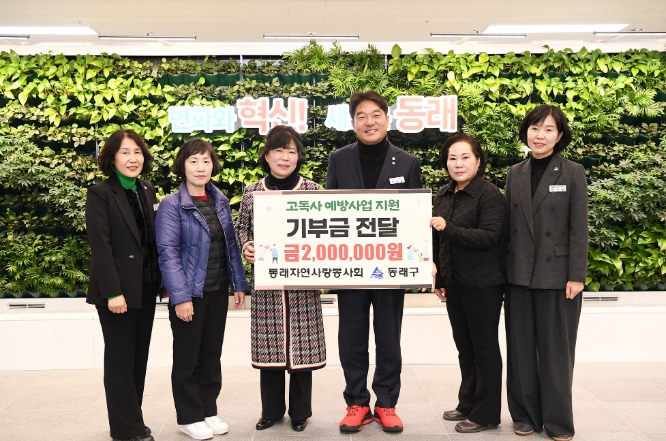 [메이저뉴스] 부산 동래구는 지난 8일 동래자연사랑봉사회(회장 김영미)로부터 연말을 맞아 관내 고독사 예방 사업 지원을 위한 기부금 200만 원을 전달받았다고 밝혔다.