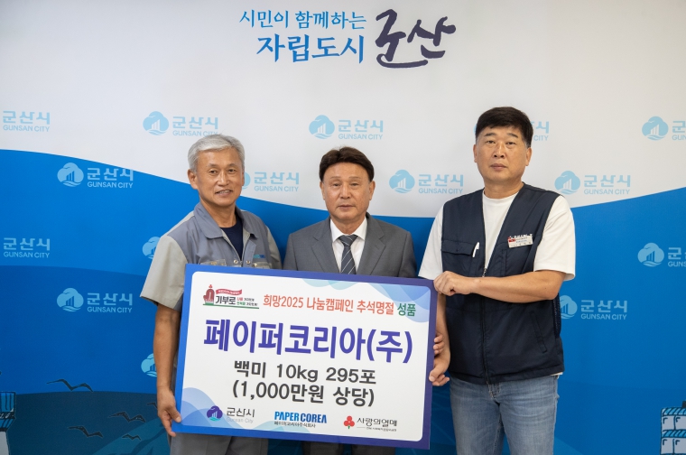 [메이저뉴스]군산시는 페이퍼코리아㈜(대표이사 권육상)가 다가오는 추석, 어려운 이웃을 위해 백미10㎏ 295포(1천만 원 상당)를 기탁했다고 25일 밝혔다.