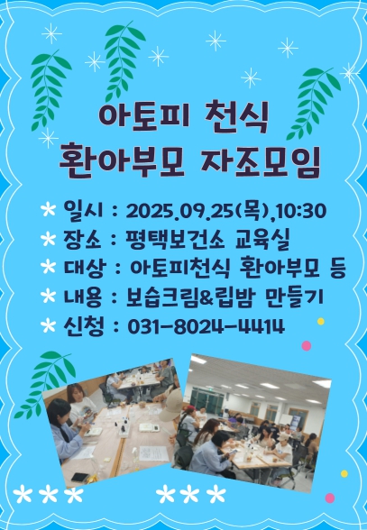특히 평택보건소는 환아 부모들이 상시로 정보를 공유하고 소통할 수 있도록 인터넷 카페 ‘아토피야 잘가~’를 함께 운영 중이다. 카페에서는 아토피·천식 관련 건강자료와 생활정보를 나누고, 자조모임 활동 소식도 확인할 수 있다.