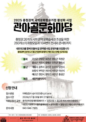 [메이저뉴스]충주문화관광재단과 충주시는 정부의 지방시대 핵심 비전인 ‘5극 3특(5대 초광역권 및 3대 특별자치도)’ 전략에 발맞춰, 충청권역의 문화적 연대를 강화하고 지역 균형 성장을 견인할 '충청권 국악문화향유거점 활성화 사업' 운영자를 오는 21일까지 공개 모집한다.