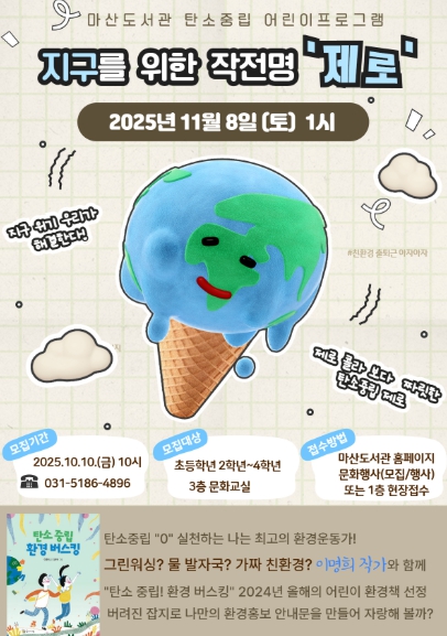 [메이저뉴스]김포시 마산도서관에서 오는 11월 8일 오후 1시부터 3시까지, 초등학교 2학년~4학년 어린이를 대상으로 탄소중립 어린이 프로그램 책풍당당 '지구를 위한 작전명 ‘제로’'를 운영한다.