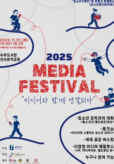 [메이저뉴스]부천시와 고리울청소년센터가 주관하는 ‘2025 미디어 페스티벌’이 오는 11월 1일 오후 1시부터 6시까지 수주도서관과 선사유적공원에서 개최된다. 이번 축제는 청소년기획단이 주체가되어 직접 기획하고 준비하여 진행하며, ‘미디어와 함께 연결되다’를 주제로, 사람-사람, 사람-기술이 미디어를 통해 함께 소통하고 공감하는 장을 마련했다.