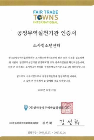 소사청소년센터는 2021년 처음 공정무역 실천기관으로 인증받은 후 2023년 1차 재인증, 2025년 2차 재인증으로 세 번째로 성과를 거뒀다. 이로써 지역 청소년과 함께 공정무역 가치 및 윤리적 소비문화 확산 활동을 본격적으로 이어갈 예정이다.