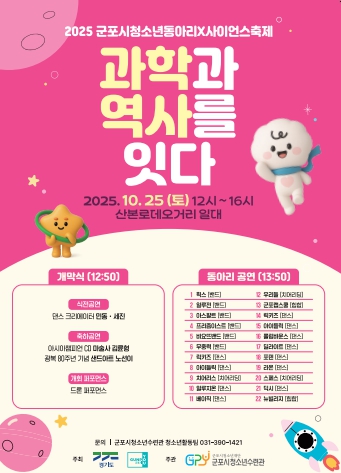 [메이저뉴스](재)군포시청소년재단 산하 군포시청소년수련관은 오는 10월 25일 12시부터 16시까지 산본로데오거리 일대에서 2025 군포시청소년동아리X사이언스축제 ‘과학과 역사를 잇다’를 펼친다. 청소년들에게 공연과 과학, 역사 체험의 기회를 제공하고 지역사회의 참여를 끌어내겠다는 취지이다.