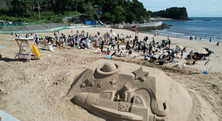 특히, 한국 최초의 모래조각가 김길만 작가가 ‘우주+가족’을 주제로 대형 모래조각을 선보이며 남일대 해변에 특별한 장관을 연출했다.