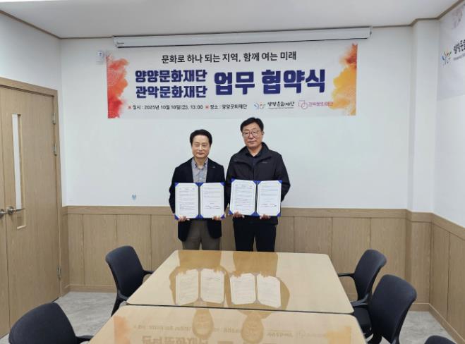 [메이저뉴스]양양문화재단과 관악문화재단은 10일 ‘문화예술 발전 및 교류 활성화 협력체계 구축’을 위해 업무협약을 체결했다.