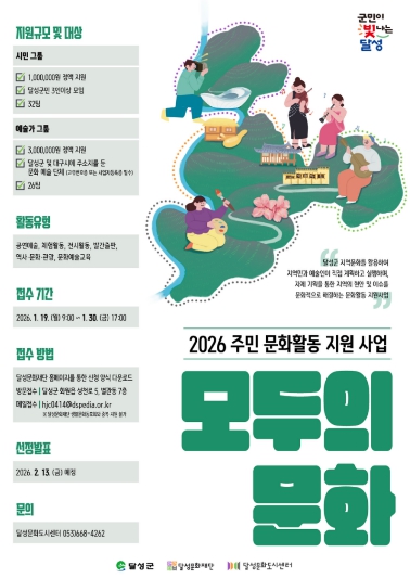 [메이저뉴스](재)달성문화재단 달성문화도시센터는 오는 30일까지 지역 주민과 예술가들의 문화활동 지원 사업 ‘모두의 문화’에 참여할 단체를 모집한다고 12일 밝혔다.