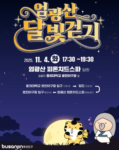 [메이저뉴스] 부산 부산진구는 오는 11월 4일 오후 5시 30분에 동의대학교 효민야구장 앞에서 자연환경과 음악·퍼포먼스가 어우러진 엄광산 달빛걷기 행사를 개최한다고 밝혔다.