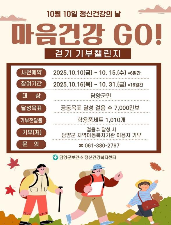 [메이저뉴스]담양군은 10월 10일 ‘세계 정신건강의 날’을 맞이하여 전 군민을 대상으로 걷기 기부 챌린지를 운영한다고 밝혔다.
