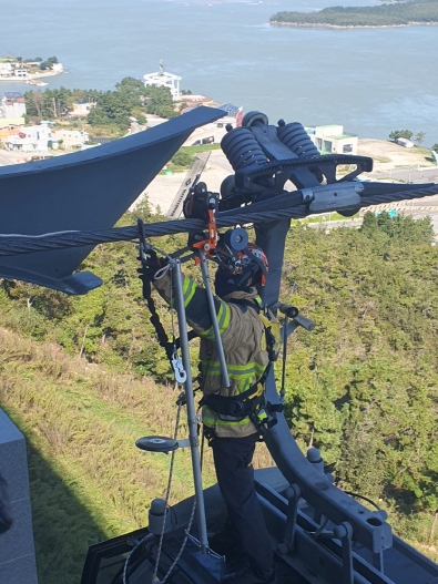 [메이저뉴스]진도소방서는 10월 20일 명량해상케이블카 진도스테이션에서 삭도시설 민관합동 구조훈련을 실시했다. 이번 훈련은 전국적으로 노후화가 진행 중인 관광용 삭도설비와 최근 증가하는 설치 현황에 대응하기 위해 마련됐다.
