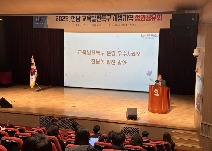 [메이저뉴스]전라남도교육청이 12월 3일 화순하니움문화스포츠센터에서 ‘2025. 교육발전특구 시범지역 교육청-지자체 합동 성과공유회’를 열어 교육발전특구 사업 추진 경과를 돌아보고, 2027년 교육발전특구 정식 지정을 위한 향후 과제를 논의했다.