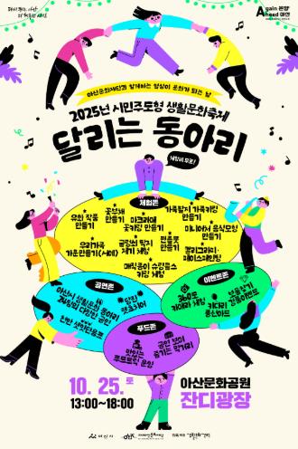 [메이저뉴스](재)아산문화재단은 오는 10월 25일 13시부터 18시까지 아산문화공원 잔디광장에서 시민이 주체가 되어 즐기는 ‘2025년 시민주도형 생활문화 축제 '달리는 동아리'’를 개최한다.