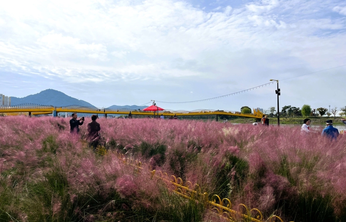 [메이저뉴스]장성군 황룡강 가을꽃축제 이튿날인 19일, 강변 곳곳마다 활짝 핀 가을꽃들이 방문객을 반기고 있다. 특히 용작교, 황룡정원 방면 백일홍과 연꽃정원 코스모스, 문화대교 인근 핑크뮬리가 아름답다.