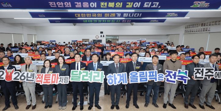 | ▲ '도민과 함께하는 2026년 시군 방문'에 나선 김관영 전북특별자치도지사는 14일 진안군을 방문해 도민과의 대화 시간을 갖고 전춘성 진안군수를 비롯한 참석자들과 하계올림픽 전북 전주 유치기원 퍼포먼스를 갖고 있다. |