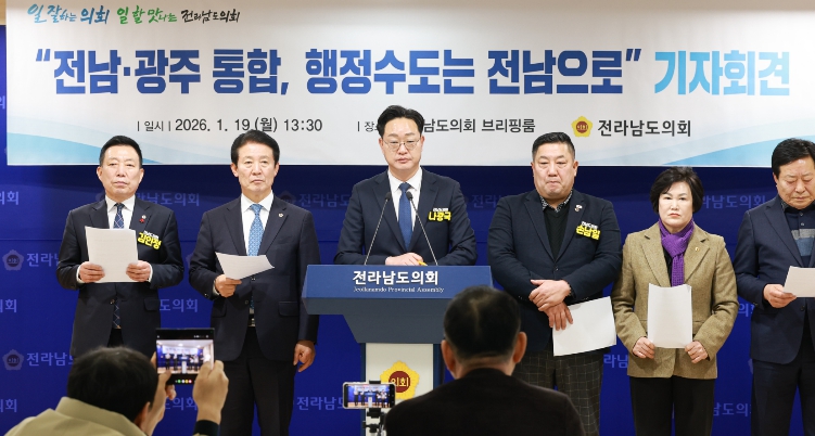 [메이저뉴스]나광국(더불어민주당·무안2)은 1월 19일 13시 30분 전남도의회 브리핑룸에서 기자회견을 열고, “향후 출범할 통합 지자체의 행정청사와 자치단체장의 근무지는 반드시 현재 전남도청이어야 한다”고 강력히 주장했다.