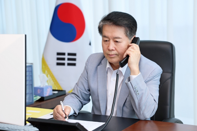 ▲ 캄보디아 한국인 범죄피해 관련 정명규 재캄보디아한인회장과 통화하는 김경협 재외동포청장 |