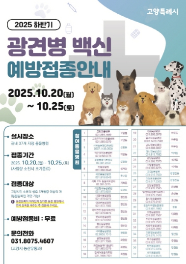 [메이저뉴스]고양특례시는 2025년 하반기 광견병 예방접종을 10월 20일부터 실시한다고 밝혔다.