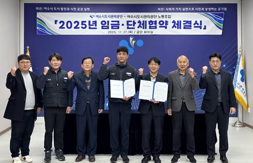 [메이저뉴스]여수시도시관리공단은 올해 9월 단체협약 체결에 이어, 지난 27일 공단 회의실에서 교섭대표 노동조합과 ‘2025년 임금협약’ 체결식을 개최했다.