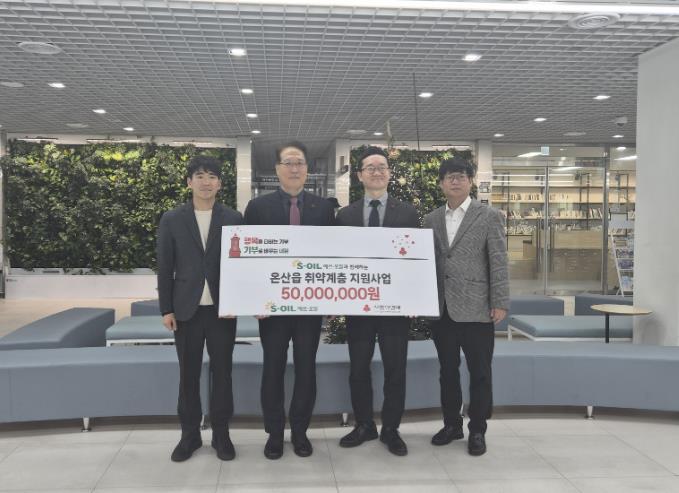 [메이저뉴스]S-OIL 울산공장이 5일 울주군 온산읍 행정복지센터에서 이준호 온산읍장, 박성훈 S-OIL 상무, 박광철 온산읍 지역사회보장협의체 위원장, 양호영 울산사회복지공동모금회 사무처장 등이 참석한 가운데 온산읍 취약계층 지원금 5천만원을 전달했다.
