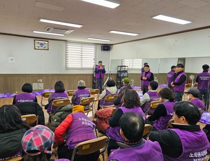 전달은 노학동 봉사단체 ‘희망지기단’이 맡는다. 희망지기단은 노학동 관내 복지통장과 지역사회보장협의체 위원은 물론 복지서비스 제공을 희망하는 주민들도 함께 참여하는 복지 공동체다. 이들은 대상 가구를 직접 방문해 건강 상태를 확인하고 주거환경을 살피는 한편, 말벗 활동 등 정서적 지지도 함께 진행한다.