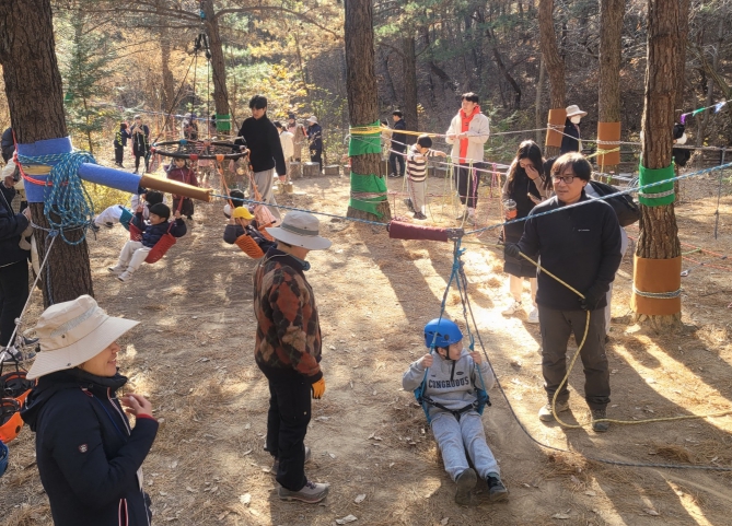 특히, 자연에서 즐기는 밧줄 놀이는 아이들이 자기의 신체 움직임을 조절하며 도전 의식을 키울 수 있어 학부모들의 큰 호응을 얻었다.