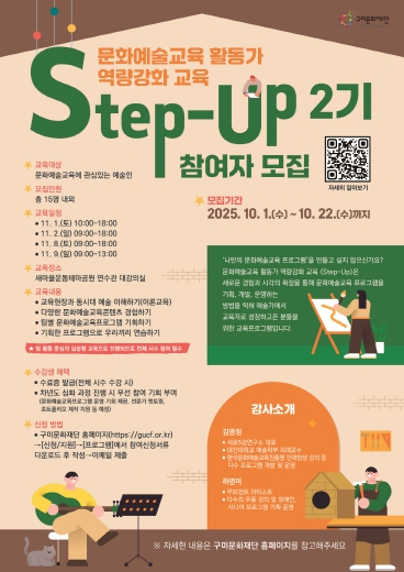 [메이저뉴스](재)구미문화재단은 문화예술교육 활동가 역량강화 교육 프로그램 'Step-Up' 2기 참여자를 오는 10월 1일부터 22일까지 모집한다고 밝혔다.