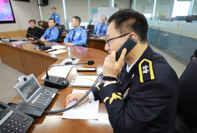 | ▲ 제11대 박재화 청장이 3005함장과 화상통화를 진행 중이다. |