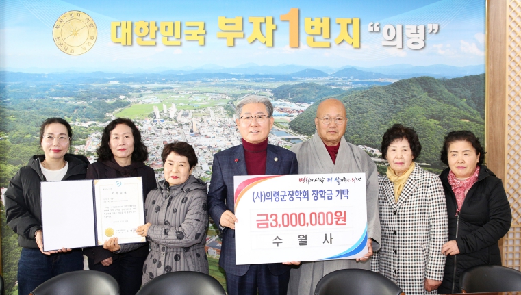 [메이저뉴스]의령군은 지난 11일 의령읍에 위치한 수월사가 지역 교육 발전을 위해 (사)의령군장학회에 장학금 300만 원을 기탁했다고 밝혔다.