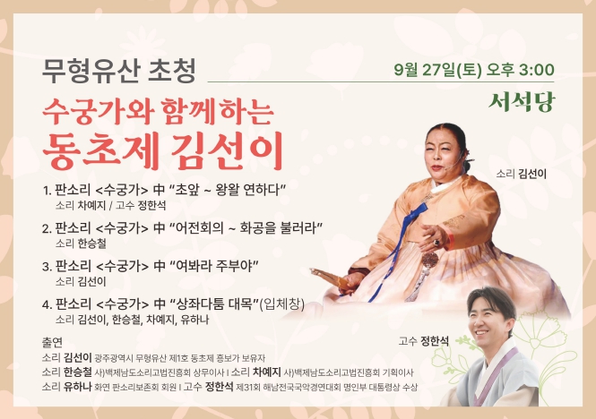 [메이저뉴스] 광주문화재단 전통문화관은 오는 9월 27일 오후 3시, 토요상설공연 20회차 무대에서 광주광역시 무형유산 제1호 동초제 흥보가 보유자 김선이 명창과 차세대 소리꾼들이 함께하는 특별한 판소리 무대를 선보인다.