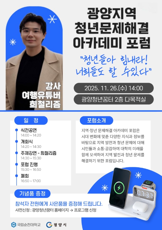 [메이저뉴스]광양시는 순천대학교 ‘글로컬대학30 사업’과 연계해 오는 11월 26일 오후 2시, 광양청년꿈터에서 ‘2025 광양지역 청년 문제 해결 아카데미 포럼’을 개최한다고 밝혔다.