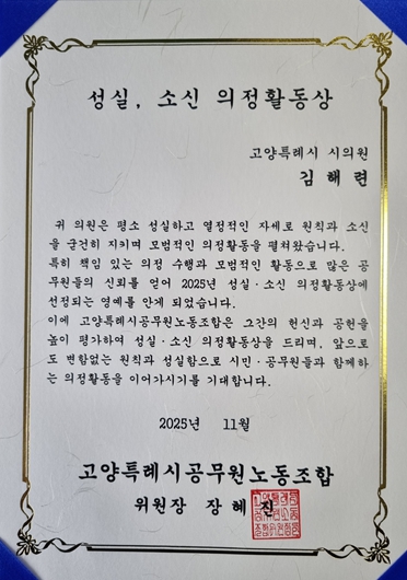 김해련 의원은 “3,500명이 넘는 고양시 공무원 여러분이 주신 상이라 더 무겁고 소중하다”며 “집행부를 감시·견제하는 역할은 냉정하게 하되, 시민을 위한 정책과 사업을 추진할 때는 공무원들과 한 팀이라는 마음으로 더 적극적으로 협력하겠다”고 답했다.